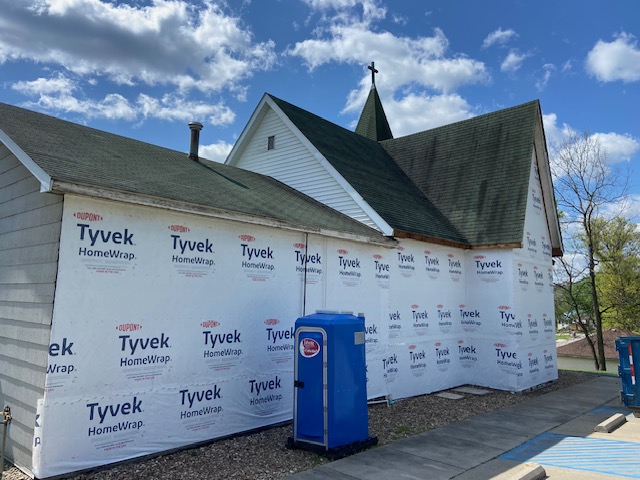 We told you in an older post that the siding and windows would come down and the plywood and Tyvek would go up and that’s exactly what’s been happening over the past couple of days! When we arrived for Mass this morning we were excited to see one whole side of the building covered in Tyvek wrap. One step at a time but it’s all coming together beautifully!