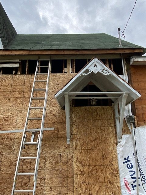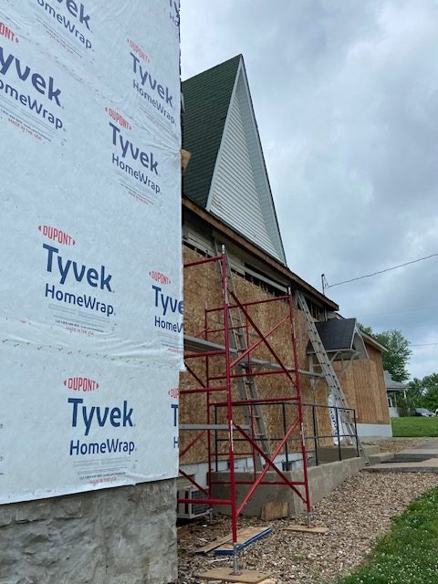 See, we told you the walls wouldn’t be open for long. The old siding is gone and it’s been replaced with new plywood in preparation for brand new siding.